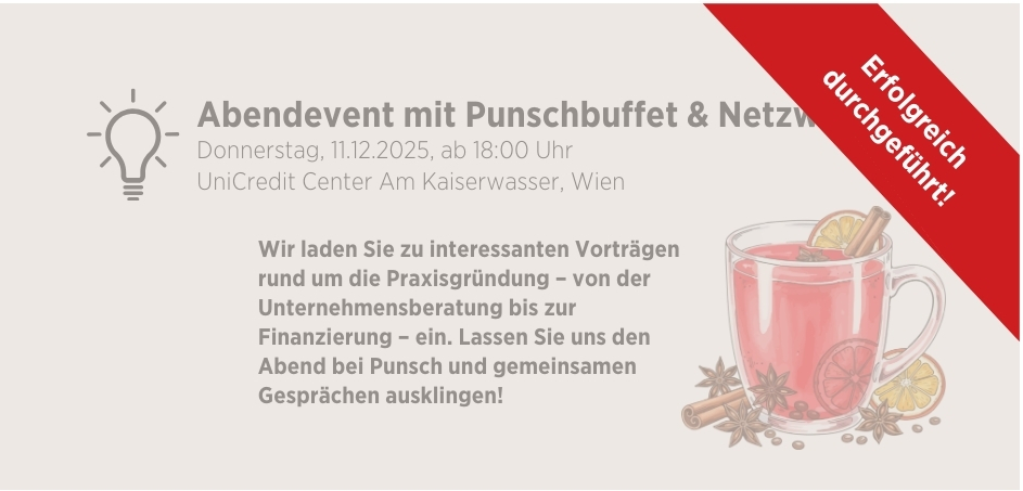 Am Donnerstag, den 11.12.2025 lud die Österreichische Tierärztekammer, der Österreichische Tierärzteverlag und die Bank Austria UniCredit zu einem informativen und inspirierenden Abend rund um die Praxisgründung und Selbstständigkeit: Im Rahmen des „Gründerinnen-Service“-Abendevents standen praxisnahe Vorträge, hilfreiche Inputs von Expert*innen sowie das Netzwerken beim Punschbuffet im Mittelpunkt – eine ideale Gelegenheit für potenzielle Gründer*innen und Studierende der Veterinärmedizin mit etablierten Tierärztinnen und Fachexpert*innen ins Gespräch zu kommen. Gemeinsam mit Bank Austria-Berater und Gastgeber Erich Czermak führte Mag. Kurt Frühwirth, Präsident der Österreichischen Tierärztekammer durch den Abend. .