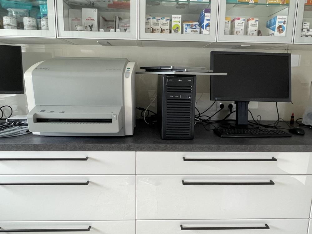 Examion Kombiserver 1TB, Speicherfolienkassette 24x30cm für CR SMART (2x), Speicherfolienkassette 35x43cm für CR SMART (1x), Betrachtungsmonitor EIZO RadiForce MS230W, Examion Software VET AQS CR